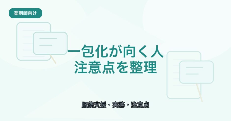 大切なのは、一包化そのものを目的にしないことです。患者さんがどこで困っているかを確認し、その解決策として一包化が合うかどうかを見ると実務に合います。