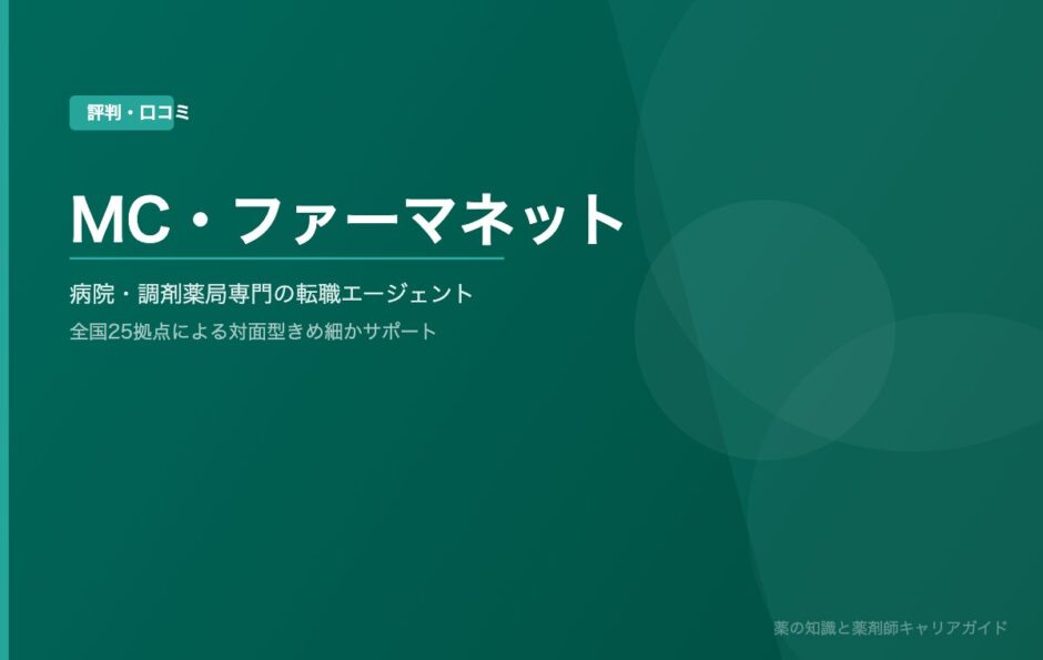 MC・ファーマネットは、エムシーヘルスケア株式会社が運営する薬剤師専門の転職エージェントです。調剤薬局・ドラッグストアへの転職を専門としており、小規模ながらも丁寧なマッチングで高い評価を得ています。