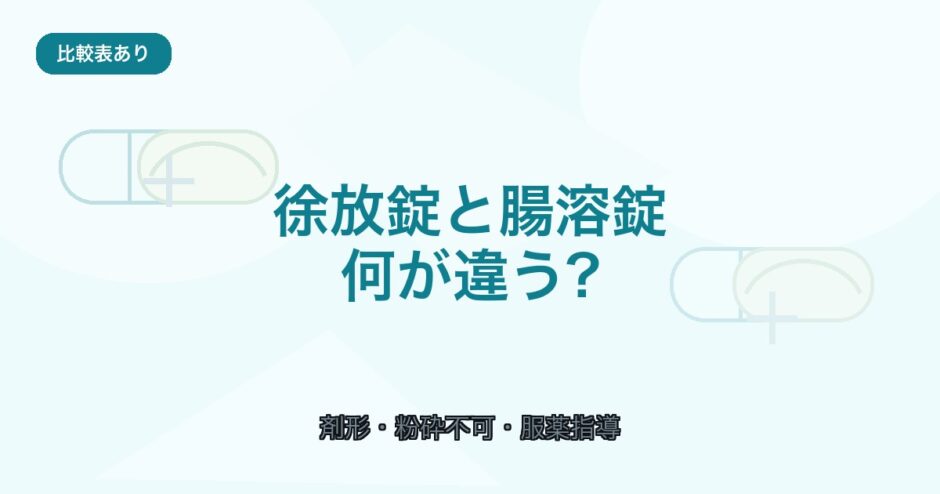 この記事では、徐放錠と腸溶錠の違い、なぜ割ってはいけないのか、どんな患者説明が伝わりやすいか、簡易懸濁や粉砕で注意したい点まで、非医療者にもわかりやすく整理します。