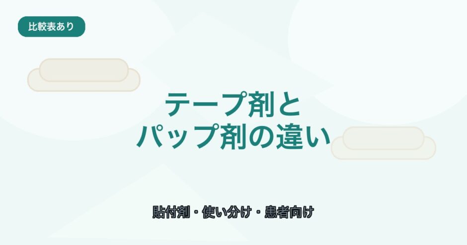 この記事では、テープ剤とパップ剤の違い、それぞれの特徴、どんな使い分けがあるか、どんな患者さんに向いているかを、非医療者にも分かるように整理します。現場での説明にそのまま使いやすいように、比較表と具体例も入れてまとめます。